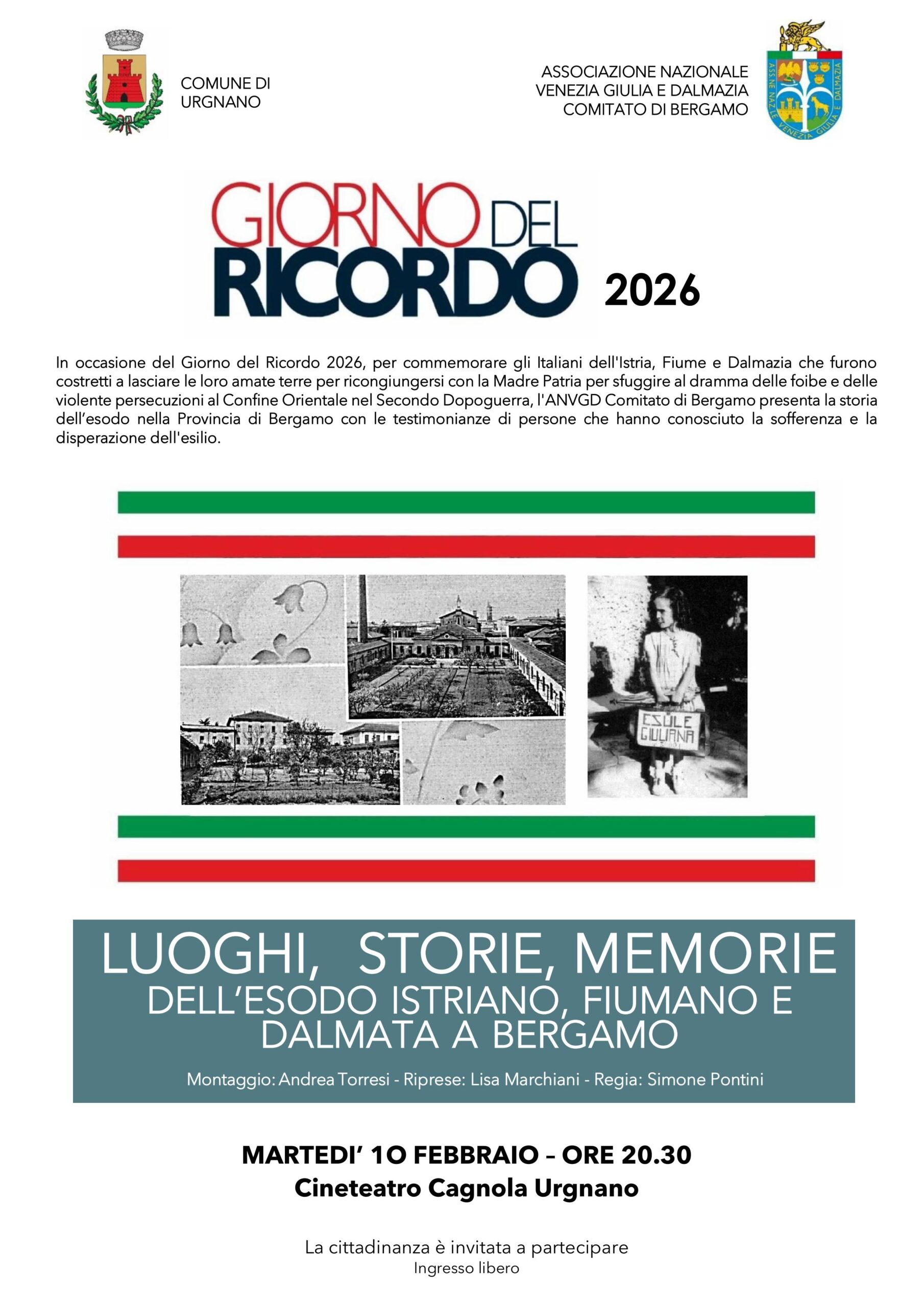 Luoghi, storie e memorie dell'esodo istriano, fiumano e dalmata a Bergamo. martedì 10 febbraio ore 20.30, presso Cineteatro Cagnola, incontro e testimonianza con un esule
